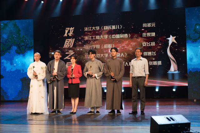 获奖的有浙江大学、浙江师范大学、宁波大学、嘉兴学院、浙江工商大学、杭州师范大学、温州大学、丽水学院、浙江艺术职业学院。后宫电影院 王金超同学获得话剧周导演奖。另外的导演奖获奖者有方桂林、沈骁婧、桂迎、史昕。《初心》中的安飞扬同学(饰毛泽东)获得戏剧之星。其余获奖者为“戏剧之星”获得者是何逸飞(杭州师范大学《北京人》)、庄家婕(浙江工商大学《中国制造》)、闫圣元(浙江大学《赵氏孤儿》)、张着盛(浙江艺术职业学院《茶人杭天醉》)。演员扎实的台词功底,富有感染力的舞台表现力让每一个观众都大呼过瘾,掌声久响不歇。