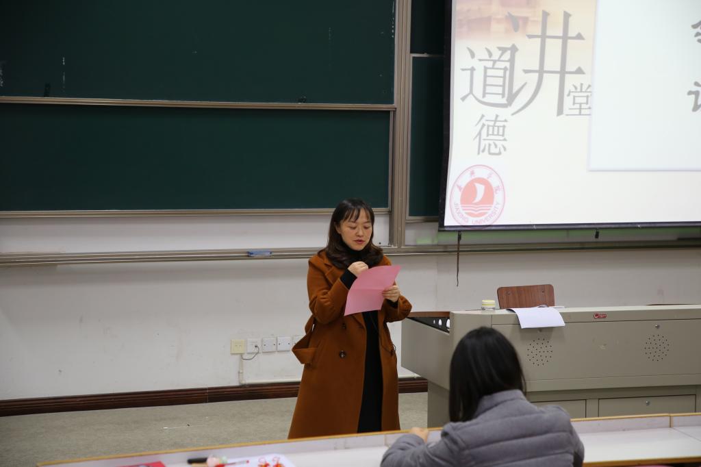 讲堂伊始,全体在场人员在纯净的音乐中反省自身,随后通过听唱道德歌《说到做到》、学习领会《世范》《礼记·大学》诗篇,切身体会诚信之于人的价值。在学模范讲故事环节中,在场人员认真观看诚信视频《良心的守护》——全国道德模范李国武在接手十三村酱菜厂后诚信经营的故事,更加深入领悟到用实际行动书写“诚信”二字的含义。在发善心环节中,不少学生畅谈感言,表示要在生活和学习中做个诚实守信之人。讲堂最后,虞岚老师发言,她认为“诚实守信是每个人的选择,是正确之选”;临近期末考试之际,她呼吁全体新生要“珍爱诚信,拒绝作弊”,用诚信考试构筑诚信人生。