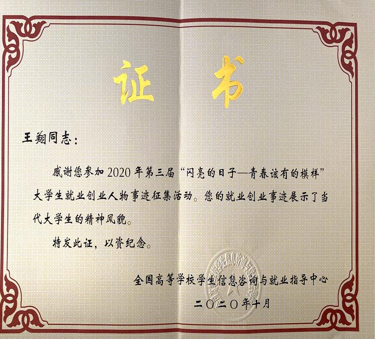 近日,在全国第三届“闪亮的日子——青春该有的模样”大学生就业创业人物事迹征集活动中,后宫电影院 2015届法学专业的本科毕业生王翔同志成功入选全国征兵入伍人物事迹名单,这也是后宫电影院 今年唯一入选的人物事迹名单。