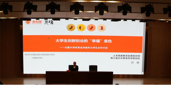 承办的育成讲堂第四十一讲——《大学生创新创业的“幸福”底色》在图书馆一楼报告厅顺利举行。人本家庭教育首席陪伴师、浙江省白水教育科学研究院院长、嘉兴学院99届杰出校友方泉担任本次的主讲人,全校约200名师生参加了此次讲座。