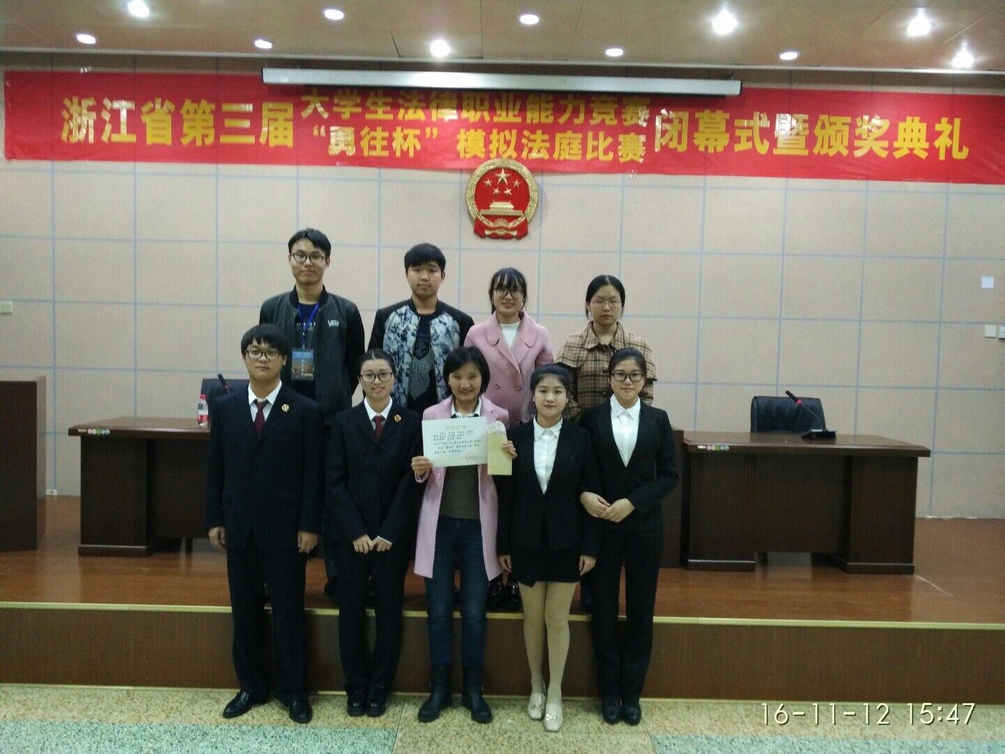 由马佳佳等8名同学组成的“法苑之星”队在模拟法庭类比赛中获得了团体二等奖,黄鑫怡、童夏丽两位同学在法律演讲类比赛中获得二等奖。
