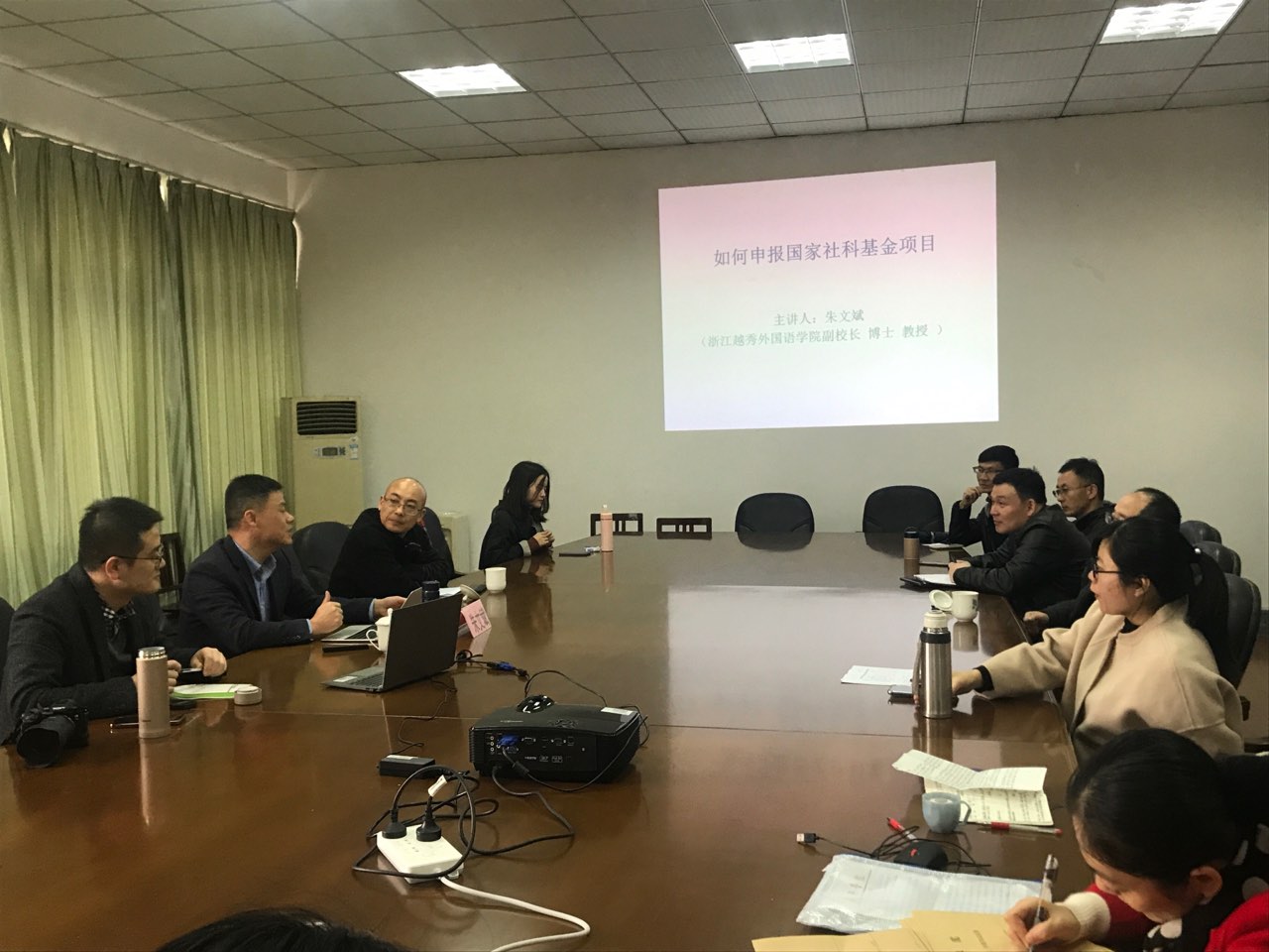 2020年11月26日下午,浙江越秀外国语学院副校长朱文斌应邀到后宫电影院 作题为“如何申报国家社科基金项目”的交流辅导会。此次辅导会在梁林校区一号楼426会议室举行。朱校长主要从课题申报的概况、相关的注意事项、如何填报申请书以及自己的心得体会等方面阐述了如何才能在国家社科基金项目的申报过程中取得成功。参会教师纷纷表示,本次国家社科基金申报辅导会让老师们受益匪浅。