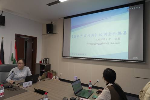张薇副教授作了题为《<嘉兴方言词典>的调查和编纂》的报告。她以《嘉兴方言词典》为例,详细介绍了曹志耘教授主编的作为中国语言资源保护工程专项研究应用类、地方标志性成果的《浙江方言词典(系列)》,指出其知识典藏型词典的定位、按义类排列的体例、方言注音方案的制定与编纂过程中的收词原则,展示了序、凡例、方言概况、词典正文、附录、附图、同音字汇、索引、后记、音频等全书结构。同时,深入探讨了词典编纂中遇到的实际问题,包括嘉兴方言音系问题、音译外来词在嘉兴话中的留存和使用问题等。