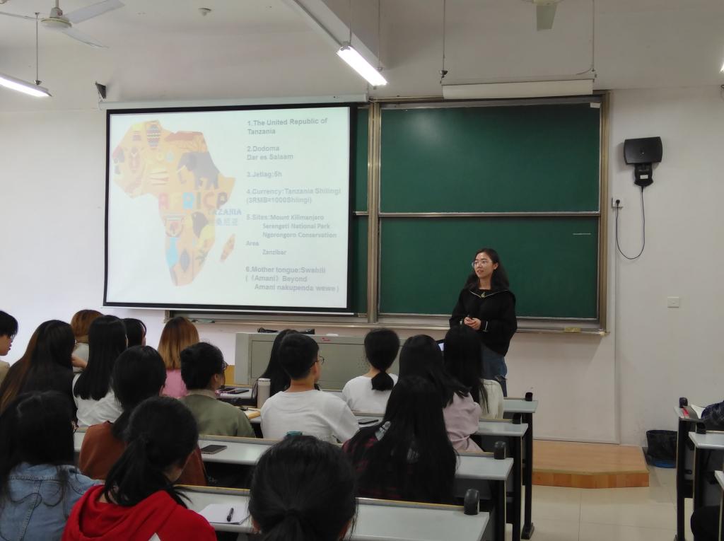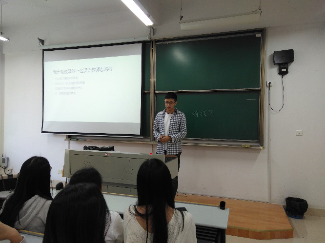 宣讲动员会上,屈正林老师首先从“汉语热”开始,阐述了作为汉语教师志愿者的重要意义,鼓励同学们积极参与,提升自我。然后简要介绍了孔子学院和汉语志愿者项目的基本情况,接着向同学们讲解了汉语志愿者项目申报条件、程序、录取培训及派出等各项事宜,并强调了诸多注意事项。归国志愿者胡馥筠、俞上分别结合自己在坦桑尼亚和喀麦隆做志愿者的亲身经历,图文并茂给大家展现了国家汉办汉语教师志愿者的真实生活、工作和工资待遇及志愿者的申请条件和要求,分享了作为志愿者的感想。最后针对大家的提问,老师们和两位归国志愿者一一作了耐心解答。