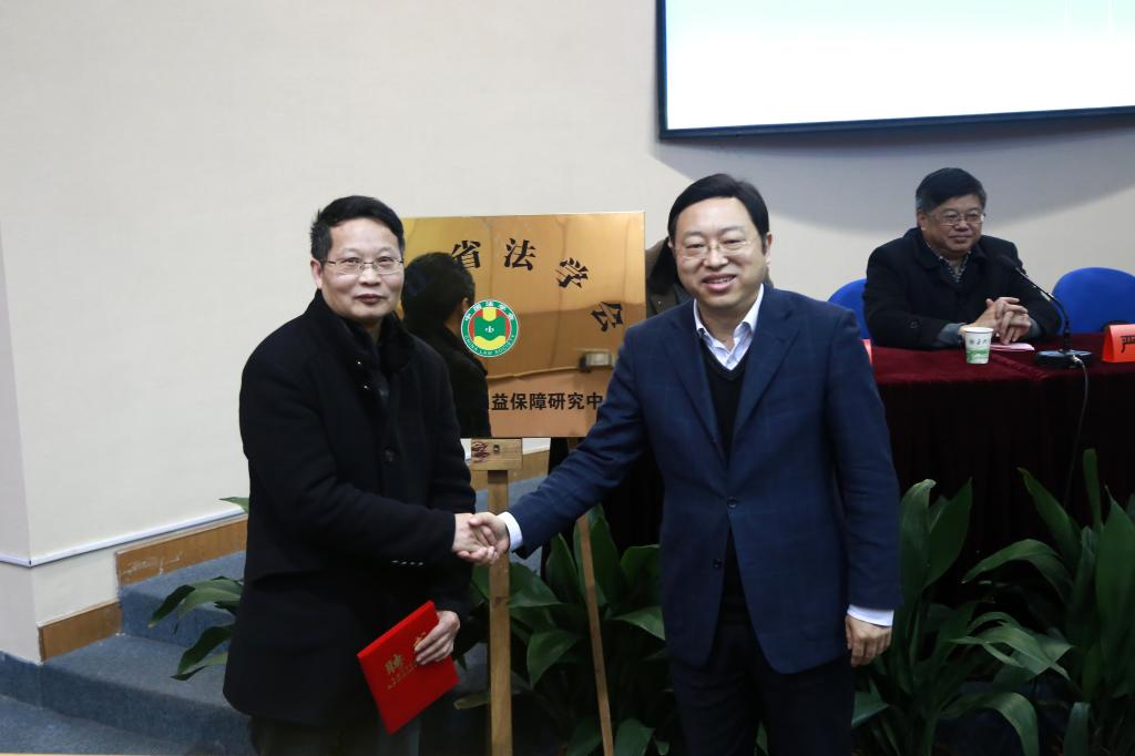 已有相关工作的肯定,也是对我们的鞭策和鼓励,学校将会在各个方面积极支持该中心的建设与发展。严从荃副校长期待继续得到省法学会、以浙江农林大学为依托的三法治研究会和其他兄弟单位的大力支持,发挥各自优势、整合研究力量和研究资源、形成合力,为法治浙江的发展做出更大的贡献!省法学会研究部副调研员李先福宣读了《关于成立浙江省法学会合作社与农民权益保障研究中心的通知》、陆剑锋副会长与严从荃副校长共同为研究中心揭牌、陆剑锋副会长为研究中心主任欧阳仁根颁发了聘书。三农法治研究会名誉会长赵兴泉参事、三农法治研究会会长金佩华副校长分别为大会致辞。赵兴泉参事在致辞中指出,三农法治研究领域是一座富矿,希望三农法治研究会和合作社与农民权益保障研究中心两个平台发挥整体优势,合力研究以取得有理论价值和资政价值的研究成果,通过成果体现平台的作用并且以此获得政府部门和社会各界的支持。金佩华副校长在致辞中对研究中心的成立和三农法治研究会年会的召开表示祝贺,希望两个平台整合力量,每年聚焦一两个选题、产出一两份有分量成果,通过年初制定工作计划、年中组织实施、年会进行总结加以实施。