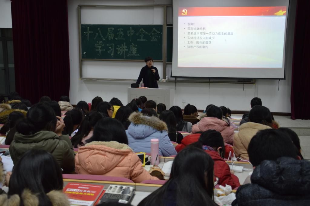 2015年12月16日,后宫电影院 党委在梁林校区7号楼报告厅组织学生学习十八届五中全会精神。本次学习会由学工办主任虞岚主持,后宫电影院 党委书记费锦红主讲。
