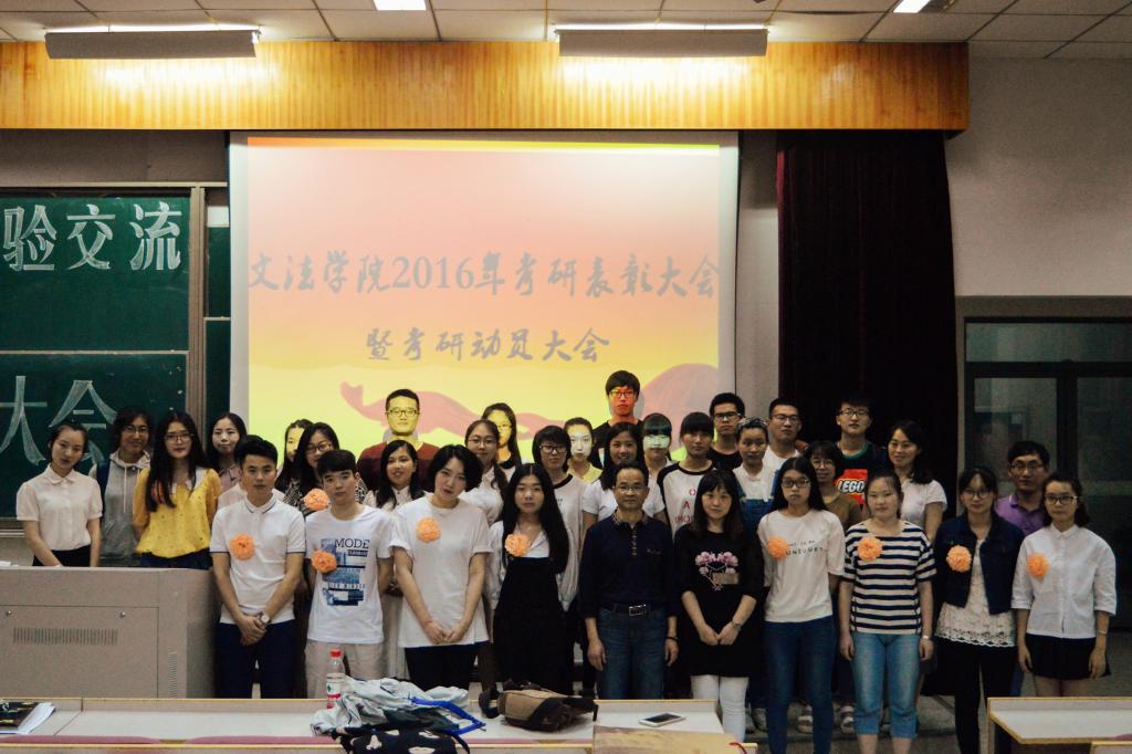 在梁林校区7号楼报告厅举行了考研经验交流暨表彰大会。学院领导、学工办老师、22位考研录取同学和各年级有志考研的学生代表等200多人参加了本次大会。会议由学院党委副书记步珏良老师主持。本次大会的意义在于两点:一是奖励2016成功考取研究生的同学,激励文法的学子通过考研改变命运,创造更有价值的人生。二是让有考研志向的同学学习他们宝贵的学习经验。