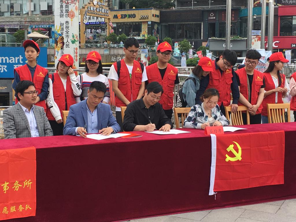 55日下午2时,嘉兴学院后宫电影院 法学学科党支部、专业党支部、子城律师事务所党支部共建“律政先锋”签约仪式暨党员日活动在嘉兴江南摩尔广场顺利举行。嘉兴市司法局、浙江子城律师事务所、嘉兴学院后宫电影院 法学学科党支部和法学专业党支部的相关领导、老师和学生志愿者出席了本次活动。