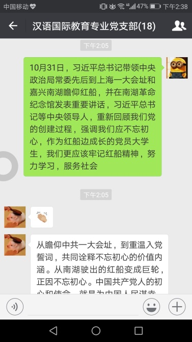 汉语国际教育专业党支部在微信群内组织全体党员学习了习近平总书记瞻仰上海中共一大会址和浙江嘉兴南湖红船,回顾建党历史的活动精神以及在南湖革命纪念馆的重要讲话精神。