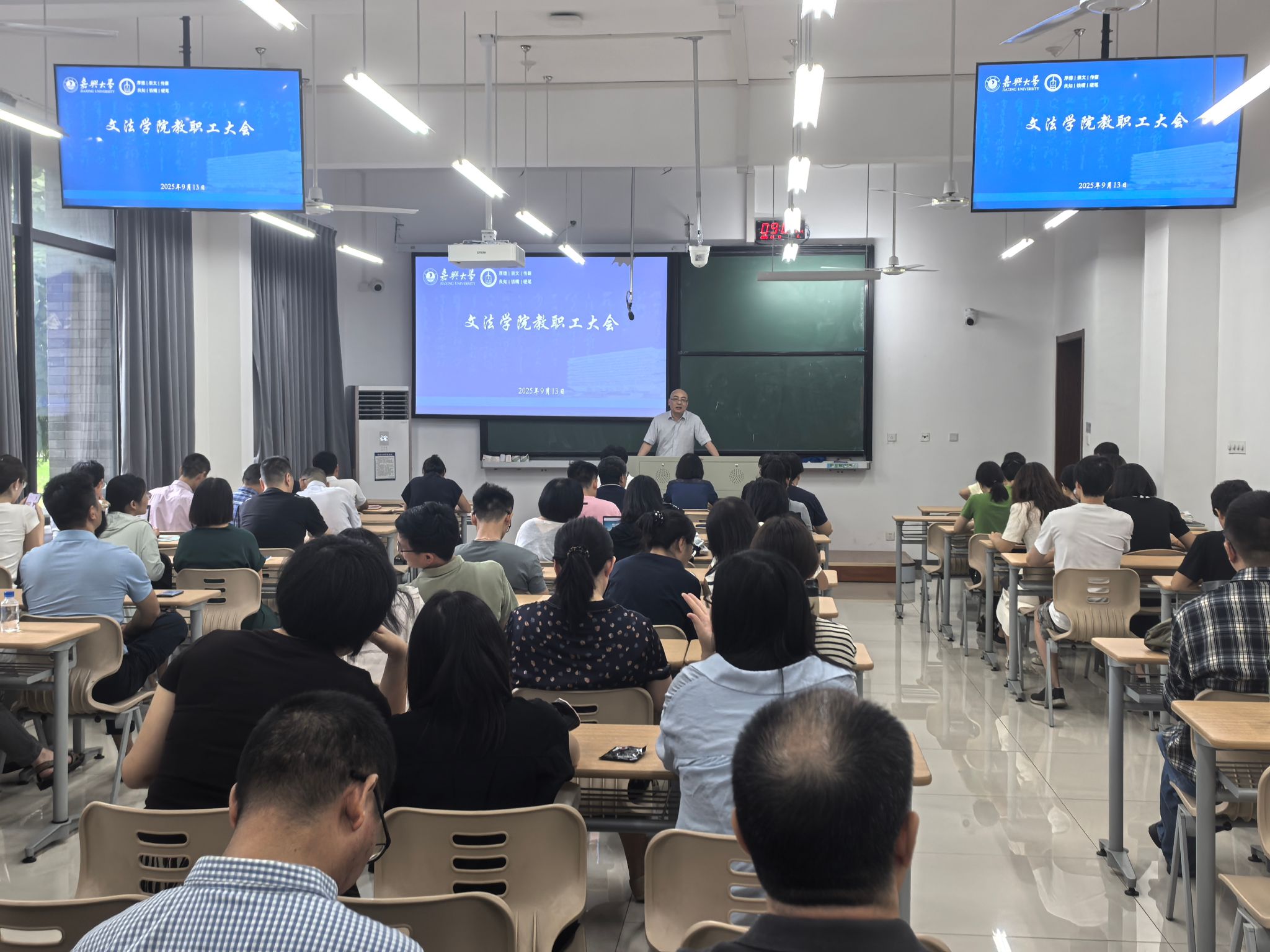 召开全体教职工大会。学院全体教职工参加会议,会议由学院党委书记童建华主持。