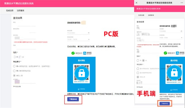 2.下载准考证网址为//pth.haremgo.com/#/query,下载后请自行用A4纸打印。《浙江省普通话水平测试考生健康状况报告表》和准考证在一张A4纸上,无需分开。建议使用电脑端或非苹果品牌手机进行下载