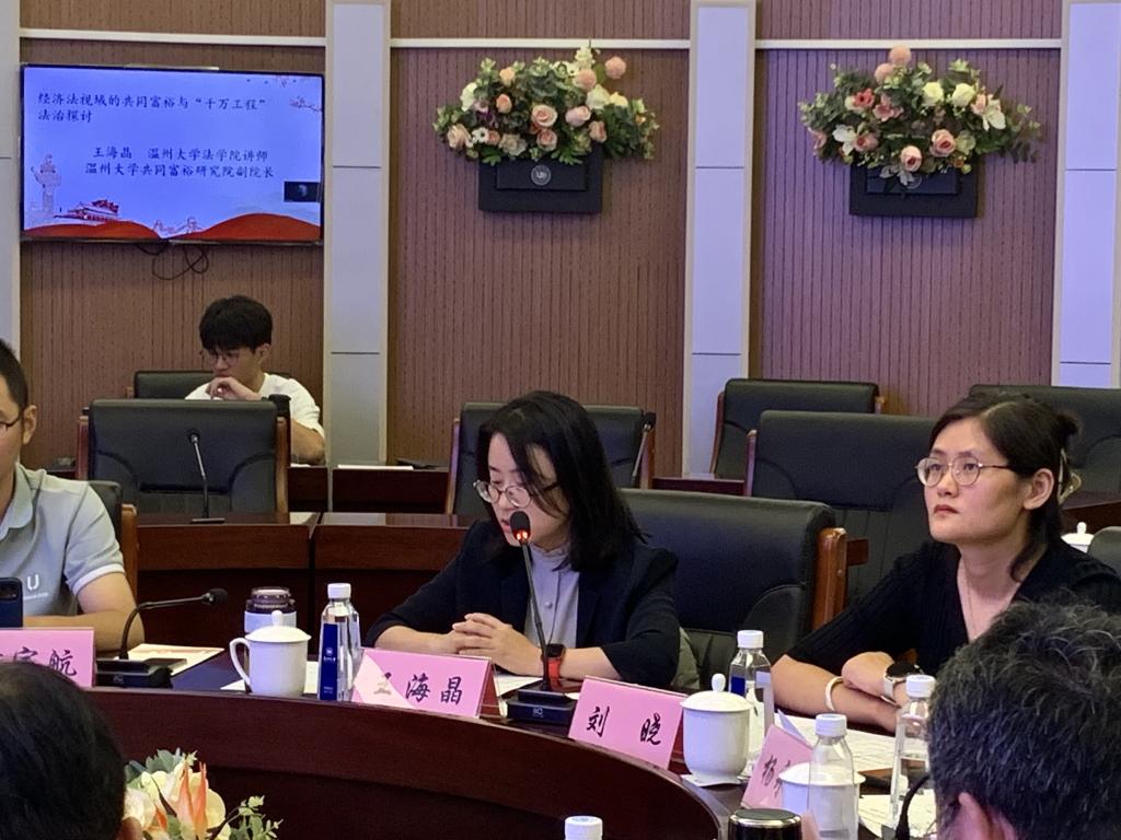 温州大学共同富裕法治研究院副院长、法学院王海晶老师以《经济法视域的共同富裕与“千万工程”法治探讨》为题,认为“千万工程”的推进是一个系统工程,在推进过程中应该坚持人与自然的和谐共生,强调公众本位,并从经济法的角度提出实现路径。