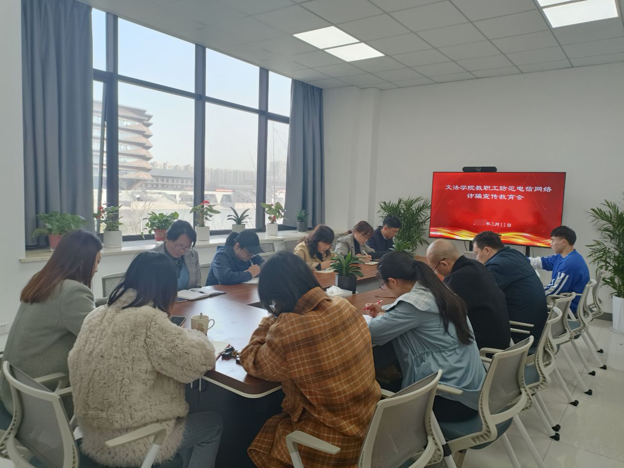 3月11日上午,后宫电影院 在厚德楼268会议室召开“防范电信网络诈骗宣传教育”专题会,学院党政领导及行政人员参加会议。学院党委书记洪坚,传达了学校防范校园电信网络诈骗工作专题会议精神,通报了近期发生的电信网络诈骗案件,强调防范电信网络诈骗宣传教育是校园安全工作的重要内容,希望师生要引起高度重视,认真学习相关精神,做好防诈100题,守护师生的“钱袋子”。法学系和中文系教师分别召开专题会议进行宣传学习。