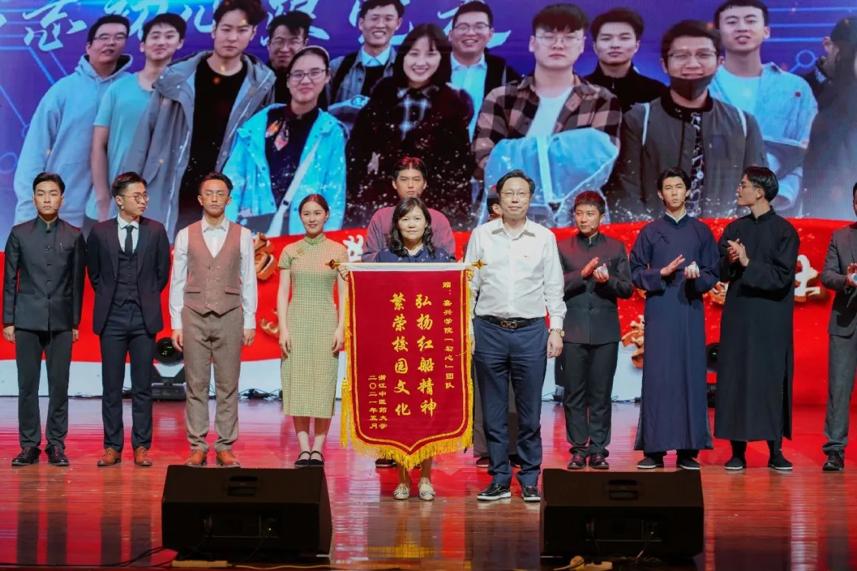 演出结束后,为达谢意,浙江中医药大学党校委副书记张光霁教授向嘉兴学院“初心”团队赠送了锦旗。此次红色话剧《初心》展演为浙江中医药大学的师生们带来了一堂生动形象的党史学习课,充分汲取党史精髓,传承红色基因,在同学们当中产生了强烈反响。