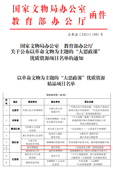 和嘉兴博物馆联合打造的“话说革命文物”系列短视频入选以革命文物为主题的“大思政课”优质资源精品项目(情景故事类)。
